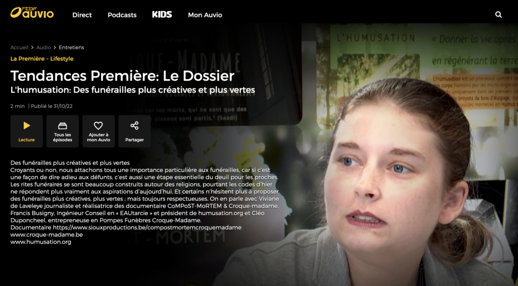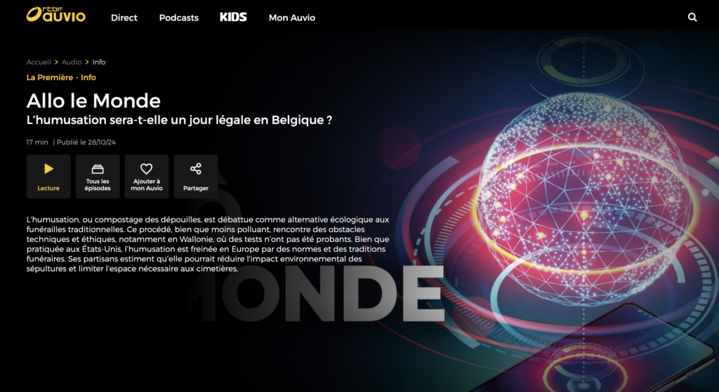 L’ASBL a pour but d’obtenir l’introduction dans le droit belge d’un nouveau mode de sépulture alternatif à l’inhumation et la crémation : le compostage funéraire. Ce procédé permet, en quelques semaines, de transformer le corps en compost, offrant ainsi un juste retour à la terre qui nous a nourri·es. L’ASBL tente également de définir un modèle économique permettant l’accès à ce mode de sépulture pour tous·tes.
